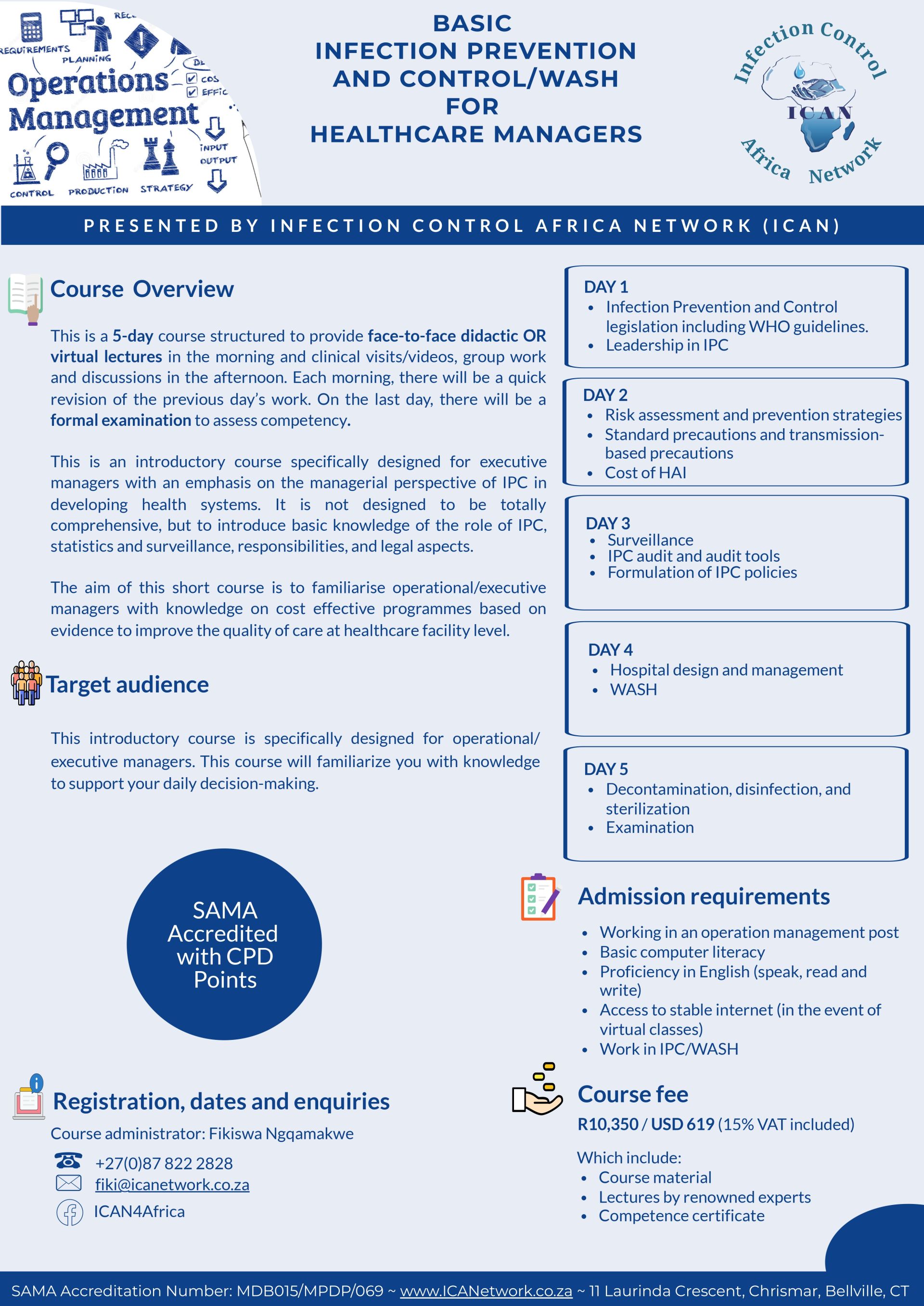 This is an introductory course specifically designed for executive managers with an emphasis on the managerial perspective of IPC in developing health systems. It is not designed to be totally comprehensive, but to introduce basic knowledge of the role of IPC, statistics and surveillance, responsibilities and legal aspects. The aim of this short course is to familiarize executive managers with knowledge on cost effective programs based on evidence to improve the quality of care at healthcare facility level.